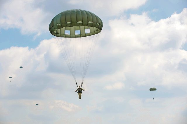 Paratroopers from Germany, France, the U.K., the Netherlands, Kosovo, the Czech Republic, Israel and the U.S. performed high-altitude, low-opening and static-line jumps out of C-130J Super Hercules aircraft from the 37th Airlift Squadron and U.S. Army CH-47 Chinook helicopters.