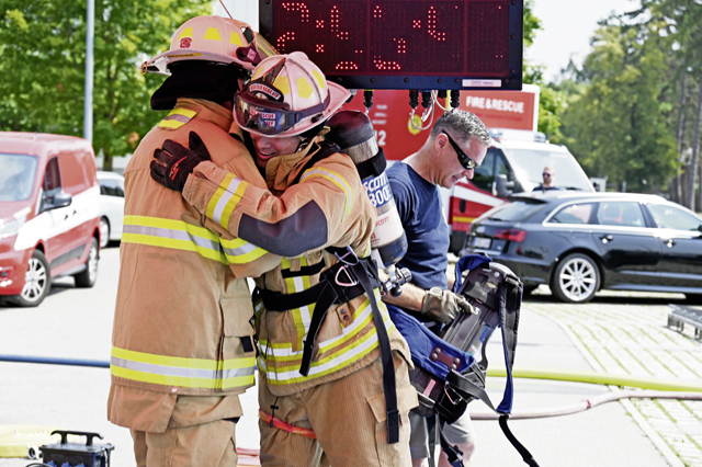 U.S. Army Garrison Stuttgart Garrison Commander Col. Edward J. Sanford and Command Sgt. Maj. Christopher Melendez embrace after participating in the U.S. Army Garrison Stuttgart Fire Department’s Firefighter Combat Challenge on Aug. 16, 2025. The challenge dates back to 1991 and has been dubbed ‘toughest two minutes in sports.’ The five-part challenge tests competitors on basic firefighting skills. More than 100 participants from German cities and U.S. Army garrisons across Europe competed. Photo by Margarita Cambest, USAG Stuttgart Public Affairs