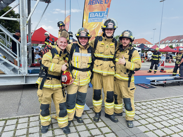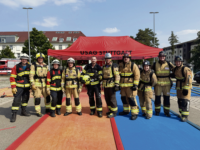 Firefighters from U.S. Army Garrison Rheinland-Pfalz and Baumholder’s fire department pose for a photo at the U.S. Army Garrison Stuttgart Fire Department’s Firefighter Combat Challenge on Aug. 16, 2025. The five-part challenge dates back to 1991 and tests competitors on basic firefighting skills. More than 100 participants from German cities and U.S. Army garrisons across Europe competed. Photo by Dayna E. Rowden, USAG Stuttgart Public Affairs