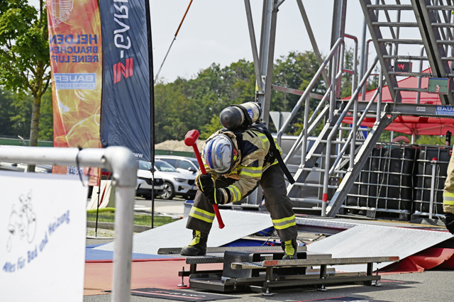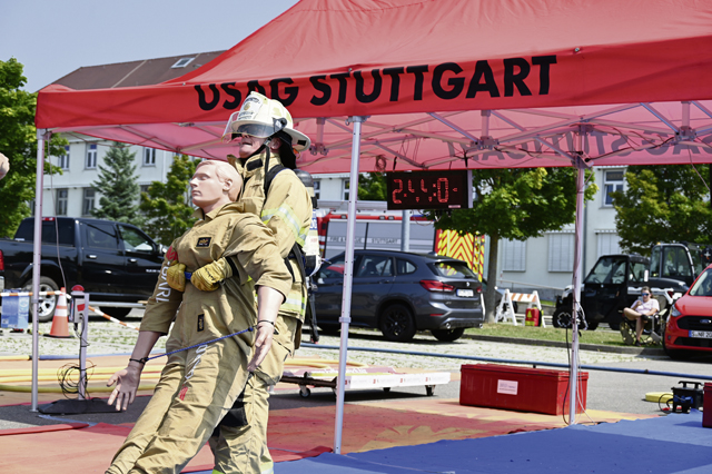 Competitors from Ramstein Air Force Base tackle the course at U.S. Army Garrison Stuttgart’s Firefighter Combat Challenge 2025. Dubbed the ‘toughest two minutes in sports,’ the five-part challenge dates back to 1991 and tests competitors on basic firefighting skills. More than 100 participants from German cities and U.S. Army garrisons across Europe competed. Photo by Margarita Cambest, USAG Stuttgart Public Affairs