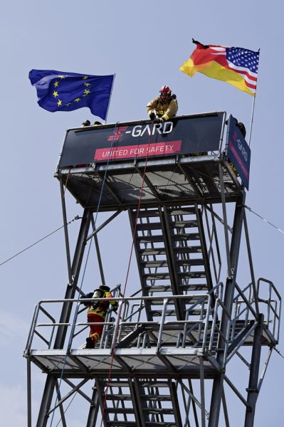 U.S. Army Garrison Stuttgart Garrison Commander Col. Edward J. Sanford participates in the tandem competition of the Firefighter Combat Challenge on Aug. 16, 2026. The challenge dates back to 1991 and tests competitors on basic firefighting skills. More than 100 participants from German cities and U.S. Army garrisons across Europe competed, including Sanford and Command Sgt. Maj. Christopher Melendez. Photo by Margarita Cambest, USAG Stuttgart Public Affairs
