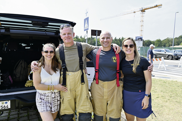 U.S. Army Garrison Stuttgart hosted the Firefighter Combat Challenge on Aug. 16, 2025. The challenge dates back to 1991 and tests competitors on basic firefighting skills. More than 100 participants from German cities and U.S. Army garrisons across Europe competed, including USAG Stuttgart Garrison Commander Col. Edward J. Sanford and USAG Stuttgart Command Sgt. Major Christopher Melendez. From left: Candice Sanford, USAG Stuttgart Garrison Commander Col. Edward J. Sanford, USAG Stuttgart Command Sgt. Maj. Christopher Melendez, and Amy Melendez. Photo by Margarita Cambest, USAG Stuttgart Public Affairs
