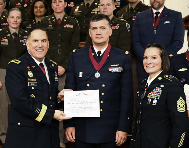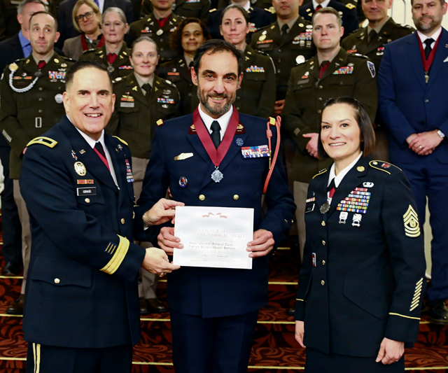 KAISERSLAUTERN, Germany – Brig. Gen. Roger Giraud (left) and Command Sgt. Maj. Kalani Kalili (right) from Medical Readiness Command, Europe present the Order of Military Medical Merit (O2M3) to French Brig. Gen. (Dr.) Erik Czerniak (center) during a News Years’ reception held Jan. 15 at the Vogelweh Armstrong Club. Czerniak earned the Order of Military Medical Merit for his significant and enduring contributions to U.S. and NATO medical interoperability. Throughout his career, he has been instrumental in synchronizing French military medical doctrine with American and coalition standards across air, sea, and land operations. His efforts have enhanced everything from in-flight casualty care and combat medical support in Afghanistan to synchronizing large-scale operational health planning. A cornerstone of his achievement includes establishing a strategic partnership between France’s Percy Military Hospital and the U.S. Army’s Landstuhl Regional Medical Center, directly strengthening coalition medical readiness and joint training capabilities in Europe.