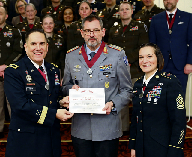 KAISERSLAUTERN, Germany – Brig. Gen. Roger Giraud (left) and Command Sgt. Maj. Kalani Kalili (right) from Medical Readiness Command, Europe present the Order of Military Medical Merit (O2M3) to Maj. Gen. (Dr.) Johannes Backus (center) during a News Years’ reception held Jan. 15 at the Vogelweh Armstrong Club. Major General (Dr.) Johannes Backus is commander of the Bundeswehr Health Care Command in Koblenz, Germany and earned the Order of Military Medical Merit for his exceptional leadership in strengthening the U.S. and German military medical partnership. He was pivotal in synchronizing the Bundeswehr’s medical operations with the U.S. Army, particularly during the Ebola and COVID-19 crises, where he ensured a unified response that protected U.S. personnel. His initiatives bolstered clinical capacity and specialty care at key U.S. military communities across Europe and aligned large-scale combat operation planning between the two nations. His efforts directly enhanced medical readiness, interoperability, and health security for U.S. forces across Germany.