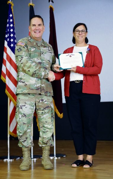 Gina Feist, Command Paralegal for Medical Readiness Command, Europe – 40 years length of service award.