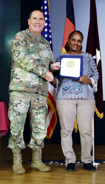 U.S. Army Brig. Gen. Roger Giraud, commander of Medical Readiness Command, Europe and director of Defense Health Network Europe, presents Gina Feist, Command Paralegal for Medical Readiness Command, Europe with a certificate for 40 years of faithful service on Aug. 6.