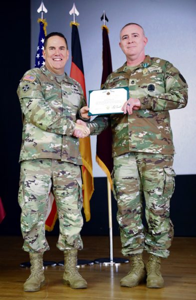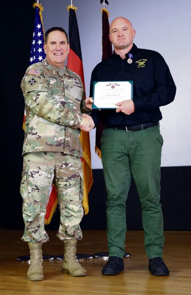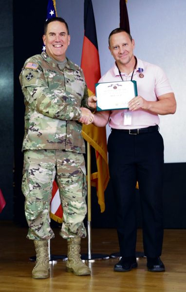 U.S. Army Brig. Gen. Roger Giraud, commander of Medical Readiness Command, Europe and director of Defense Health Network Europe, presents Donny Lafferty, Safety Manager for Medical Readiness Command Europe with a certificate for 20 years of faithful service on Aug. 6.