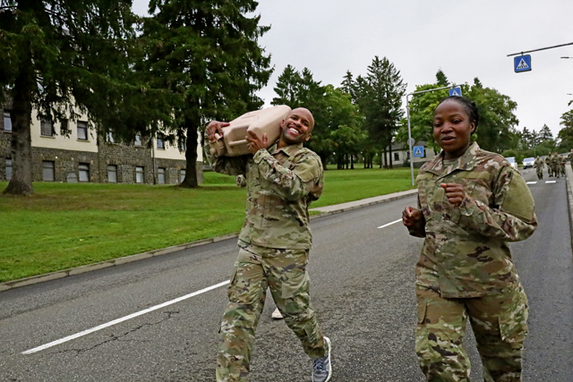U.S. Army Soldiers from the 16th Sustainment Brigade race along a designated route to reach the final station of the Ghost Rider Gauntlet, a physical readiness training competition held at Minick Field on Smith Barracks in Baumholder, Germany, Sept. 12, 2025. (U.S. Army photo by 1st Lt. Nahjier Williams)