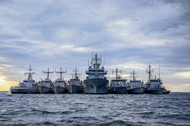 BALTIC SEA (June 16, 2020) Photoex with (left to right) Royal Norwegian Navy HNOMS Otra (M351), Royal Netherlands Navy HNLMS Zierikzee (M862), Royal Netherlands Navy HNLMS Urk (M861), Lithuanian Navy LNS Skalvis (M53), German Navy FGS Donau (A-516), Finnish Navy FNS PurunPAA (41), British Royal Navy HMS Ramsey (M110), German Navy FGS Groemitz (M1064) in the Baltic Sea during BALTOPS 2020, June 16. BALTOPS is the premier annual maritime-focused exercise in the Baltic region, enhancing flexibility and interoperability among allied and partner nations. (Photo courtesy of the Standing NATO Maritime Group 1)