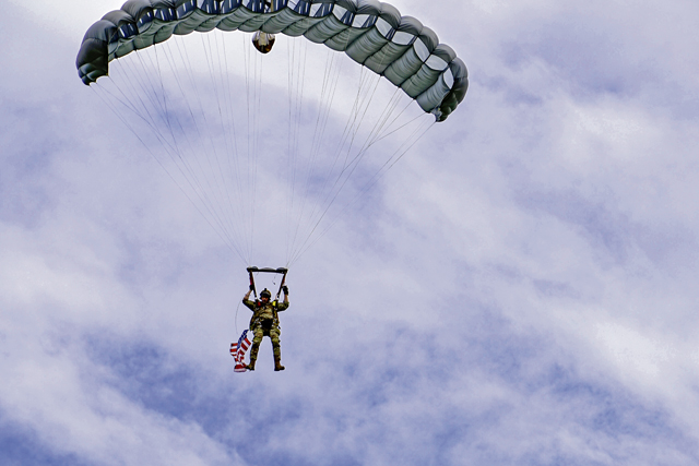 A U.S. Army Airborne soldier glides into a drop zone in Normandy, France, June 5, 2022. The soldiers landed in the same area the Germans purposely flooded during World War II in an attempt to defeat U.S. Forces. (U.S. Air Force photo by Airman 1st Class Lauren Jacoby)
