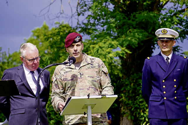 U.S. Army Gen. Christopher Donahue, commanding general of the 82nd Airborne Division at Fort Bragg, N.C., speaks to attendees at the Iron Mike Memorial Ceremony in Normandy, France, June 5, 2022. Iron Mike is an airborne trooper statue, and is a tribute to the American Soldiers who bravely fought on D-Day. (U.S. Air Force photo by Airman 1st Class Lauren Jacoby)