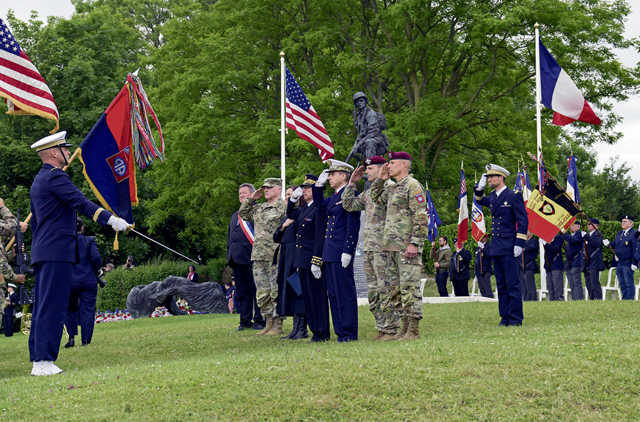Service members from varying countries present a salute during the Iron Mike Memorial Ceremony in Normandy, France, June 5, 2022. The ceremony paid tribute to those who gave the ultimate sacrifice for peace, freedom and dignity during D-Day. (U.S. Air Force photo by Airman 1st Class Lauren Jacoby)
