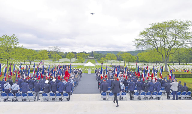 A 37th Airlift Squadron C-130J Super Hercules flies over a Memorial Day ceremony May 29 at Lorraine American Cemetery and Memorial in St. Avold, France. The flyover renders honor to those buried in the cemetery.