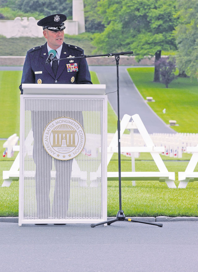Brig. Gen. Jon Thomas, 86th Airlift Wing commander, delivers a speech during a Memorial Day ceremony May 29 at Lorraine American Cemetery and Memorial in St. Avold, France.