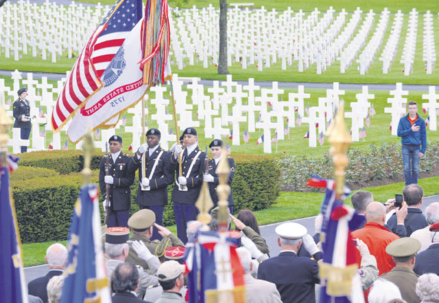 Members of the 16th Sustainment Brigade present the colors during a Memorial Day ceremony May 29 at Lorraine American Cemetery and Memorial in St. Avold, France. Memorial Day recognizes men and women who have died while serving in the Armed Forces.