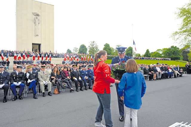 French Girl Scout members present a wreath to Brig. Gen. Jon Thomas, 86th Airlift Wing commander, during a Memorial Day ceremony May 29 at Lorraine American Cemetery and Memorial in St. Avold, France.
