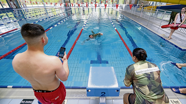 U.S. military personnel swim to the edge of a pool during a 100-meter swim event as part of the German Armed Forces Proficiency Badge competition at Ramstein Air Base, Germany, April 22, 2024. The swim was one of several exercises U.S. military personnel had to undergo to earn the German Armed Forces Proficiency Badge. The GAFPB is an award given by the German Armed Forces to foreign military personnel who complete a series of rigorous testing, showing exceptional physical prowess, combat skills and proficiency across various disciplines. (U.S. Air Force photo by Staff Sgt. Gabrielle Spalding)