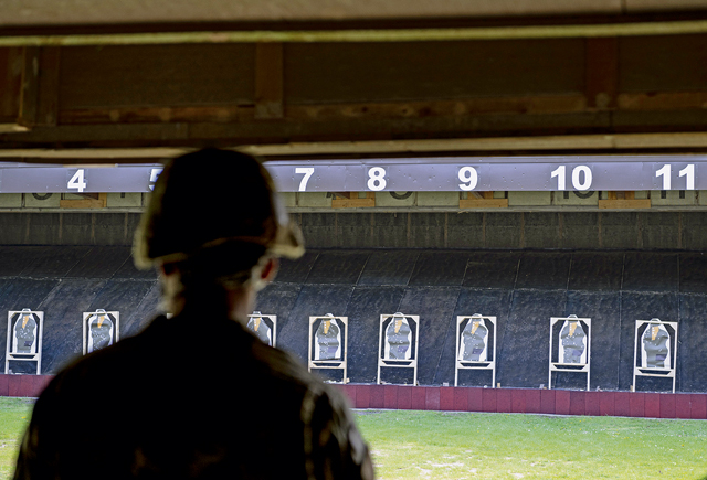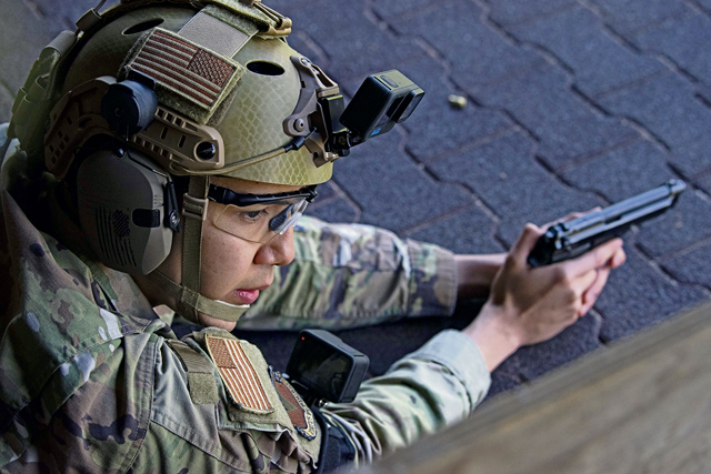 A U.S. service member looks at targets prior to taking part in a 9mm pistol qualification event as part of the German Armed Forces Proficiency Badge competition at the Breitenwald Shooting Range in Landstuhl, Germany, April 23, 2024. The GAFPB is an award given by the German Armed Forces to foreign military personnel who show exceptional physical prowess, combat skills and proficiency across various disciplines. (U.S. Air Force photo by Staff Sgt. Gabrielle Spalding)