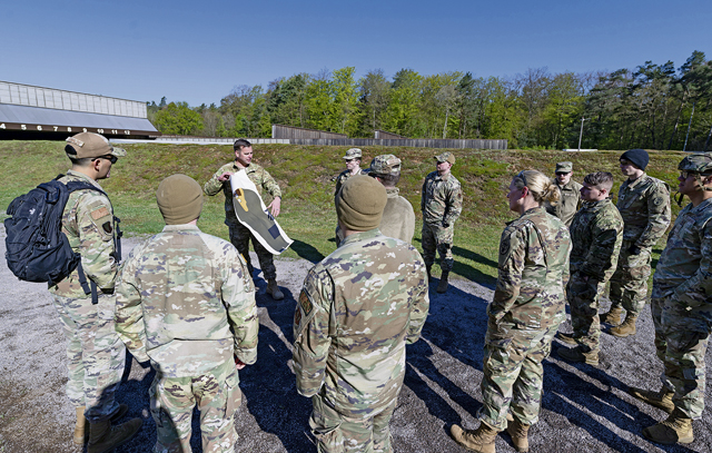 U.S. military personnel receive a brief on shooting and aiming techniques before participating in a 9mm pistol qualification event as part of the German Armed Forces Proficiency Badge competition at the Breitenwald Shooting Range in Landstuhl, Germany, April 23, 2024. Participating in the GAFPB event facilitates cultural exchange between U.S. and German military personnel, providing service members the unique opportunity to engage in foreign military traditions, customs and values. (U.S. Air Force photo by Staff Sgt. Gabrielle Spalding)