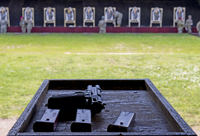 An M9 pistol and three 9mm magazines are placed in a designated location while not in use during a 9mm pistol qualification event as part of the German Armed Forces Proficiency Badge competition at the Breitenwald Shooting Range in Landstuhl, Germany, April 23, 2024. As part of the qualifications for the GAFPB, the marksmanship course was one of seven rigorous events designed to evaluate participants’ endurance, strength, accuracy and adaptability, highlighting the shared commitment to excellence within the US-German alliance. (U.S. Air Force photo by Staff Sgt. Gabrielle Spalding)