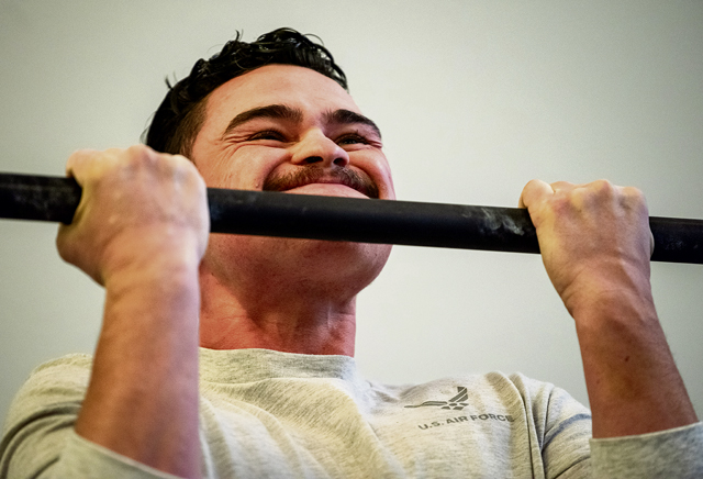 U.S. Air Force Airman hangs from a pull-up bar during the German Armed Forces Proficiency Badge competition at Ramstein Air Base, Germany, April 24, 2024. The GAFPB is an award given by the German Armed Forces to foreign military personnel who show exceptional physical prowess, combat skills and proficiency across various disciplines. (U.S. Air Force photo by Staff Sgt. Gabrielle Spalding)