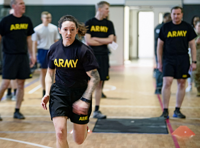 U.S. Army Capt. Jeriann Sandrick, Baumholder Army Health Clinic, Germany, chief of optometry, participates in a 11×10 meter sprint during the German Armed Forces Proficiency Badge competition at Ramstein Air Base, Germany, April 24, 2024. The process of earning the GAFPB includes completing a basic fitness evaluation; engaging in marksmanship with a pistol; a 100-meter swim in military uniform; and various other challenges over the course of multiple days. (U.S. Air Force photo by Staff Sgt. Gabrielle Spalding)