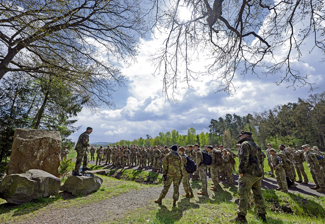U.S. military personnel receive a safety brief prior to participating in a 12-kilometer (7.5 miles) ruck march near Ramstein Air Base, Germany, April 25, 2024. As part of the qualifications for the GAFPB, the ruck march was one of seven rigorous events designed to evaluate participants’ endurance, strength, accuracy and adaptability, highlighting the shared commitment to excellence within the US-German alliance. (U.S. Air Force photo by Staff Sgt. Gabrielle Spalding)