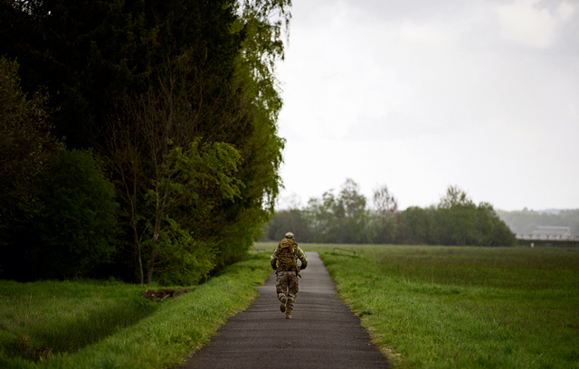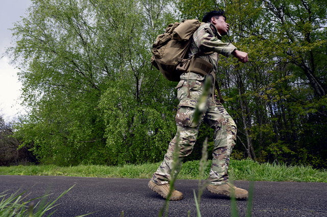 A U.S. Air Force Airman participates in a 12-kilometer (7.5 miles) ruck march near Ramstein Air Base, Germany, April 25, 2024. As part of the qualifications for the GAFPB, the ruck march was one of seven rigorous events designed to evaluate participants’ endurance, strength, accuracy and adaptability, highlighting the shared commitment to excellence within the US-German alliance. (U.S. Air Force photo by Staff Sgt. Gabrielle Spalding)