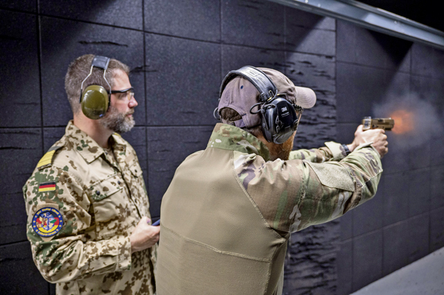 German Armed Forces Lt. Col. Philipp Blau, left, GAF commander, observes as U.S. Air Force Senior Airman Chase Chesnutt, 776th Expeditionary Air Base Squadron sustainment services journeyman, fires a Sig Sauer M18 during the shooting event for the German Armed Forces Proficiency Badge at Camp Lemonnier, Djibouti, Sep. 12, 2025. The trials for the badge offered a unique opportunity to U.S. service members and strengthened ties between the U.S. and Germany militaries. (U.S. Air National Guard photo by Staff Sgt. Kevin Ray J. Salvador)