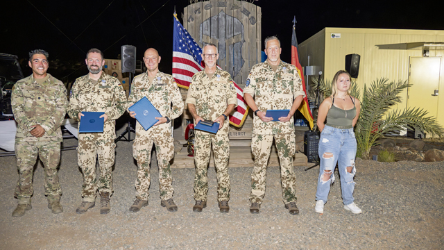 U.S. Air Force Lt. Col. Lawrence V. Melnicoff, left, 776th Expeditionary Air Base Squadron commander, hands out gifts to German Armed Forces personnel during an awards ceremony for the German Armed Forces Proficiency Badge at Chabelley Airfield, Djibouti, Sep. 13, 2025. The trials for the badge offered a unique opportunity to U.S. service members and strengthened ties between the U.S. and Germany militaries. (U.S. Air National Guard photo by Staff Sgt. Kevin Ray J. Salvador)