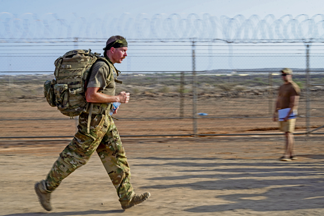 U.S. Air Force Capt. Thomas J. Wirfel, 10th Expeditionary Aeromedical Evacuation Flight nurse, races to the finish line during the ruck march event for the German Armed Forces Proficiency Badge at Chabelley Airfield, Djibouti, Sep. 11, 2025. The trials for the badge offered a unique opportunity to U.S. service members and strengthened ties between the U.S. and Germany militaries. (U.S. Air National Guard photo by Staff Sgt. Kevin Ray J. Salvador)