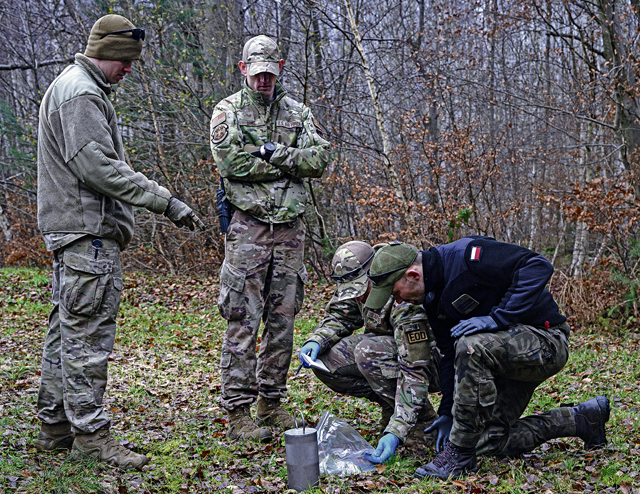 Junior Ensign Chor Blazej Basinski, Polish Army 16th Airfield Renovation Battalion Explosive Ordnance Disposal team leader, conducts post-blast analysis during training at Ramstein Air Base, Dec. 14, 2021. While the exercises are normally held in Poland, the 786th Civil Engineer Squadron EOD team had the opportunity to host the training this year for the first time.