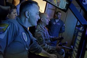 U.S. Air Force Gen. Jeffrey L. Harrigian, U.S. Air Forces in Europe-Air Forces Africa commander, operates a C-130H aircraft simulator, at Elefsis Air Base, Greece, May 15. Members of the Hellenic air force’s 356th MTM (Tactical Transport Squadron) provided Harrigian the opportunity to use their simulator during a brief visit he made to members of the 86th Airlift Wing who were participating in Exercise Stolen Cerberus VI, an annual bilateral training event which included three C-130J Super Hercules aircraft and Greek C-130H Hercules aircraft. Harrigian is a command pilot with more than 4,100 hours in the F-15C, F-22, A/OA-37 and MQ-1 aircraft.