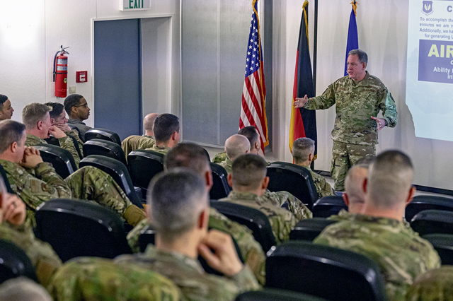 U.S. Air Force Gen. James B. Hecker, U.S. Air Forces in Europe and Air Forces Africa commander, speaks during the 2025 USAFE-AFAFRICA Mission Support and Maintenance Group Strategy Conference at Ramstein Air Base, Germany, Jan. 22, 2025. The focus of the symposium was to provide region-specific discussions and collaborative interactions from commanders and senior enlisted leaders of USAFE-AFAFRICA mission support and maintenance groups, focusing specifically on strategic thinking and joint integration. (U.S. Air Force photo by Senior Airman Renan Arredondo)