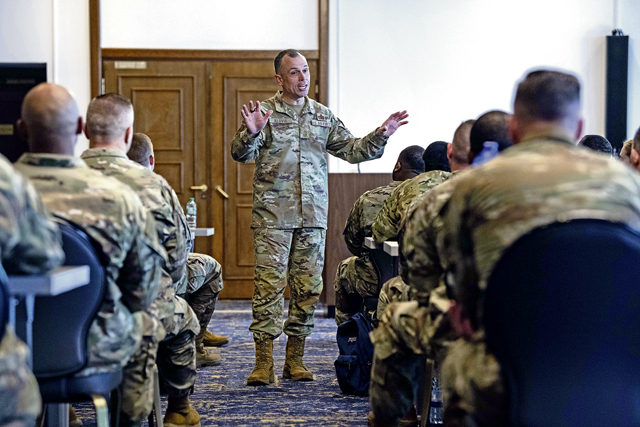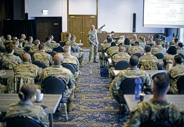 Retired U.S. Air Force Chief Master Sgt. Todd Simmons, founder of Courageous Leaders Alliance, speaks during a first sergeant symposium at Ramstein Air Base, Germany, April 2, 2024. The aim of the first sergeant symposium was to enhance the professional development of first sergeants across U.S. Air Forces in Europe and Air Forces Africa, equipping them with essential tools and strategies to better serve their units. (U.S. Air Force photo by Senior Airman Jared Lovett)