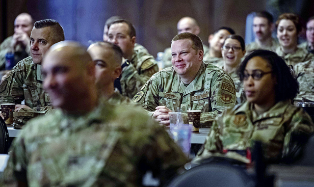 U.S. Air Force Master Sgt. Brent Bishop, 480th Fighter Generation Squadron first sergeant assigned to Spangdahlem Air Base, Germany, attends a first sergeant symposium at Ramstein Air Base, Germany, April 3, 2024. Through a series of workshops, keynote addresses and networking sessions, the event provided first sergeants with valuable insights from experienced leaders who empowered them to foster a culture of excellence and support within their units. (U.S. Air Force photo by Senior Airman Jared Lovett)