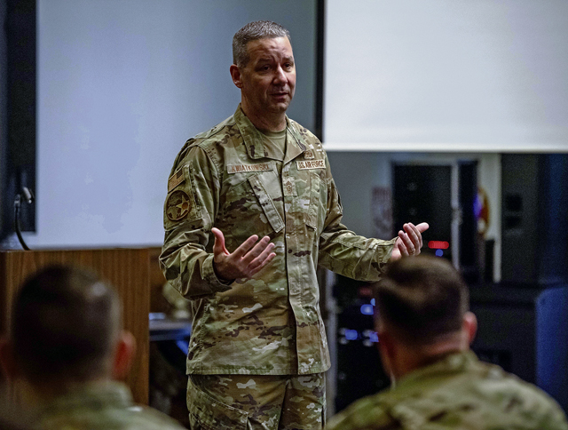 U.S. Air Force Chief Master Sgt. Randy Kwiatkowski, USAFE-AFAFRICA command chief, speaks during a first sergeant symposium at Ramstein Air Base, Germany, April 3, 2024. The symposium provided attendees with comprehensive training and guidance to excel in their roles as first sergeants. (U.S. Air Force photo by Senior Airman Jared Lovett)