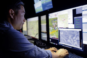 Aaron Corales, a 4th Combat Training Squadron Joint Terminal Aattack Controller simulator operator, directs a training scenario inside the battlefield dome simulator at the U.S. Air Forces in Europe and Air Forces Africa’s Warfare Center on Einsiedlerhof Air Station, Germany, June 23, 2021. Corales builds large-scale operational combat scenarios, saying the simulator gives “an accurate reflection of real-world concepts of operations to the JTACs so they are prepared when they enter the theater.” The simulator gives operators the opportunity to experience a variety of mission sets in a controlled and responsive environment. (U.S. Air Force photo by Capt. Daniel de La Fé)