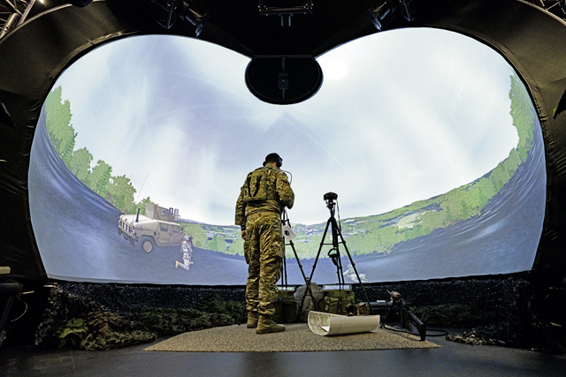 U.S. Air Force Capt. Theodore Bertsch, 4th Combat Training Squadron assistant director of operations, identifies targets inside the Joint Terminal Attack Controller battlefield dome simulator at the U.S. Air Forces in Europe and Air Forces Africa’s Warfare Center on Einsiedlerhof Air Station, Germany, June 23, 2021. The course, part of the 4th Combat Training Squadron’s three-day workshop, gave NATO operators from nearly a dozen countries the opportunity to provide feedback during the development of JTAC evaluator course for the joint warfighter. (U.S. Air Force photo by Capt. Daniel de La Fé)
