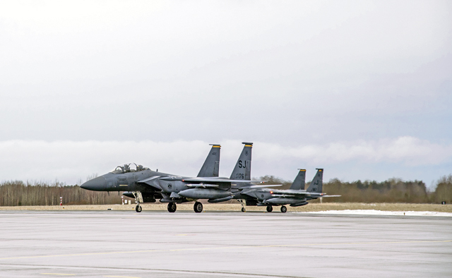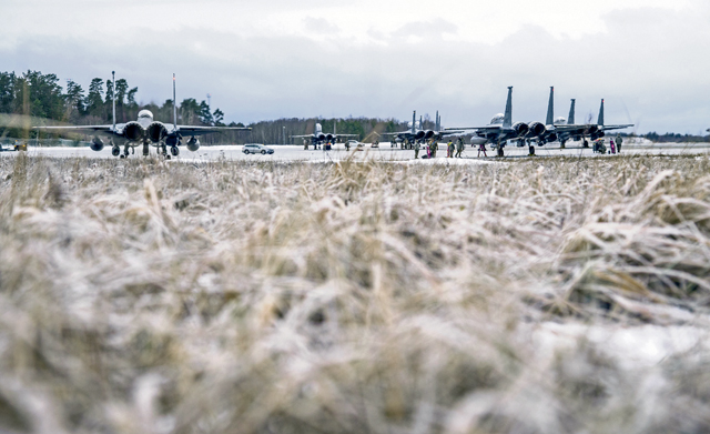 Six F-15E Strike Eagles, assigned to the 4th Fighter Wing from Seymour Johnson Air Force Base in N.C., receive routine maintenance after arriving at Ämari Air Base, Estonia, Jan. 26. The F-15E Strike Eagle is a dual-role fighter designed to perform air-to-air and air-to-ground missions, and is able to fly at low altitudes at any time of day and in all weather.