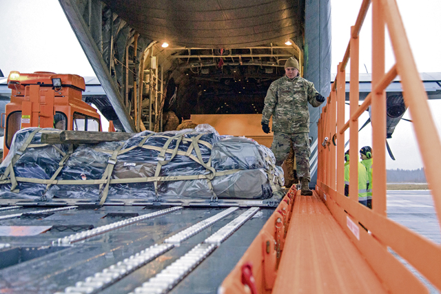 A loadmaster assigned to the 37th Airlift Squadron from Ramstein Air Base unloads cargo at Ämari Air Base, Estonia Jan. 24. Members of Ramstein Air Base delivered cargo and personnel to support a NATO enhanced air policing mission. Operations conducted with U.S. forces, allies and partners demonstrate the U.S.’ commitment to strong relationships that are necessary for peace and stability in the European theater.