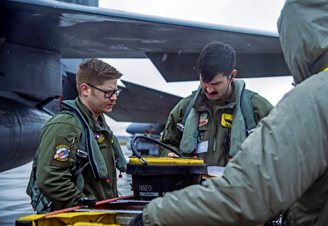 U.S. Air Force Capt. Sam Simmons, left, 336th Fighter Squadron weapons systems officer from Seymour Johnson Air Force Base, N.C., and Capt. Andrew Gikas, center, 336 FS pilot, prepare to practice alert launches in the F-15E Strike Eagle at Ämari Air Base, Estonia, Jan. 27. The F-15E Strike Eagles, along with Belgian F-16s, are deployed to Ämari AB in support of a NATO enhanced Air Policing mission. The Belgian, Estonian and U.S. Air Forces are conducting flying operations together to protect and defend allied airspace. This deployment is focused on enhancing the deterrence air posture in the Baltic region.