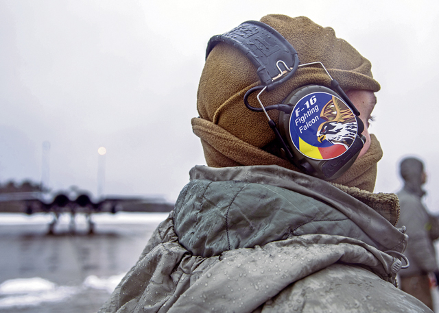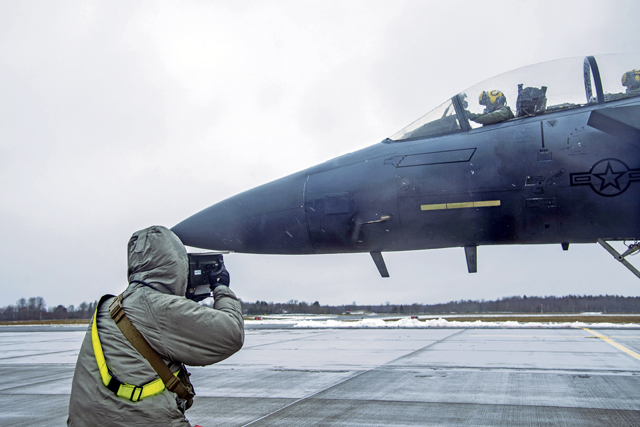U.S. Air Force Staff Sgt. Tate Larson, 336th Fighter Generation Squadron aerospace propulsion craftsman from Seymour Johnson Air Force Base, N.C., watches as members of the 336th Fighter Squadron practice alert launches at Ämari Air Base, Estonia, Jan. 27. Members of the 4th Fighter Wing are deployed to Ämari Air Base, Estonia, to support a NATO enhanced Air Policing mission.