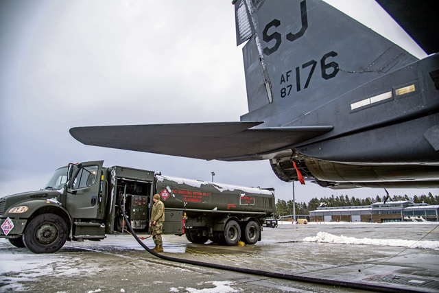 U.S. Air Force Airman Kennedy Cuellar, 4th Logistics Readiness Squadron petroleum, oil and lubricants distributor from Seymour Johnson Air Force Base, N.C., refuels an F-15E Strike Eagle at Ämari Air Base, Estonia, Jan. 28.