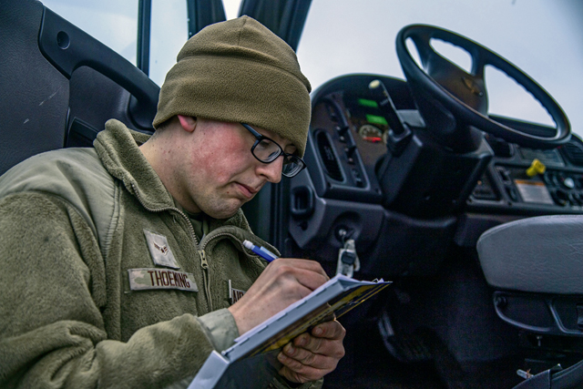 U.S. Air Force Airman 1st Class Jared Thoeming, 4th Logistics Readiness Squadron petroleum, oil and lubricants distributor from Seymour Johnson Air Force Base, N.C., notates how much fuel an F-15E Strike Eagle received at Ämari Air Base, Estonia, Jan. 28.