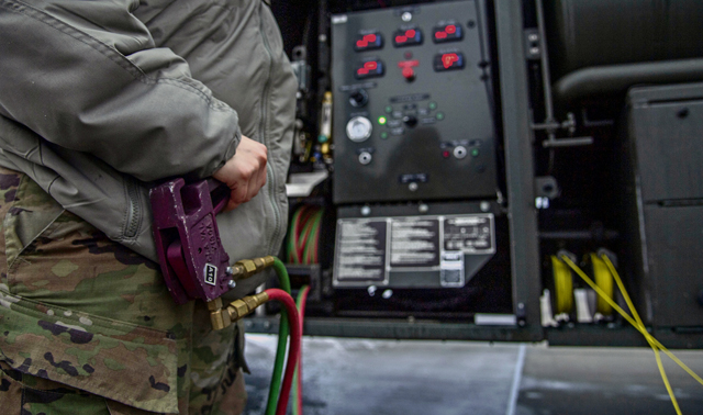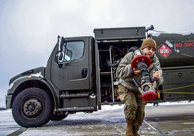 U.S. Air Force Airman Kennedy Cuellar, 4th Logistics Readiness Squadron petroleum, oil and lubricants distributor from Seymour Johnson Air Force Base, N.C., prepares to refuel an F-15E Strike Eagle at Ämari Air Base, Estonia, Jan. 28.
