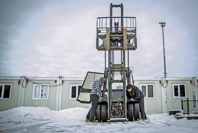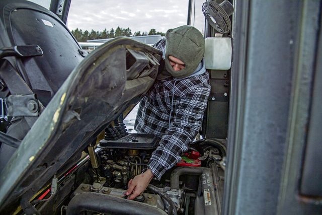 (Right) U.S. Air Force Airman 1st Class Dayln Grubb, left, 48th Logistics Readiness Squadron vehicle maintenance technician from Royal Air Force Lakenheath, and Senior Airman Jose Sanchez, right, 48 LRS vehicle maintenance technician, perform maintenance on a forklift at Ämari Air Base, Estonia, Jan. 29.