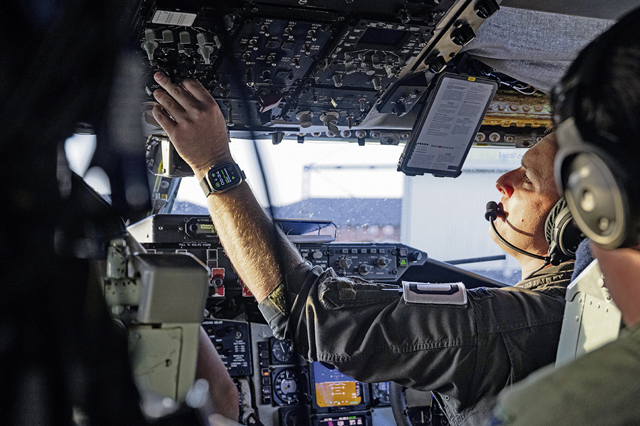 U.S. Air Force Capt. Travis Cole, 351st Air Refueling Squadron pilot, prepares for engine start procedures at Royal Air Force Mildenhall, England, Aug. 13, 2024. Preparing a KC-135 Stratotanker for takeoff requires both the aircrew and maintainers to work together to maintain safety. (U.S. Air Force photo by Senior Airman Christopher Campbell)
