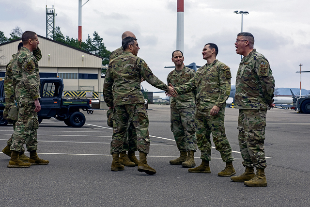U.S. Air Force Maj. Gen. John Klein, U.S. Air Force Expeditionary Center commander, and Chief Master Sgt. Courtney Freeman, USAFEC command chief, greet the 721st Aircraft Maintenance Squadron leadership team at Ramstein Air Base, Germany, Feb. 23, 2023. Klein and Freeman visited Ramstein during their tour of 521st Air Mobility Operations Wing units across Europe and attended a 721st AMXS immersion tour to learn about the mission overview, Hangar 5 capabilities and the virtual reality lab. (U.S. Air Force photo by Airman 1st Class Madelyn Keech)