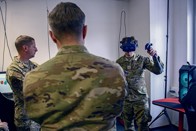 U.S. Air Force Senior Airman Kobey Oglesby, right, 721st Aircraft Maintenance Squadron electrical and environmental systems technician, demonstrates virtual reality capabilities to Maj. Gen. John Klein, center, U.S. Air Force Expeditionary Center commander, and Chief Master Sgt. Courtney Freeman, left, USAFEC command chief, at Ramstein Air Base, Germany, Feb. 23, 2023. The virtual reality lab is used to train 721st AMXS maintainers and retain proficiency in various maintenance tasks. (U.S. Air Force photo by Airman 1st Class Madelyn Keech)